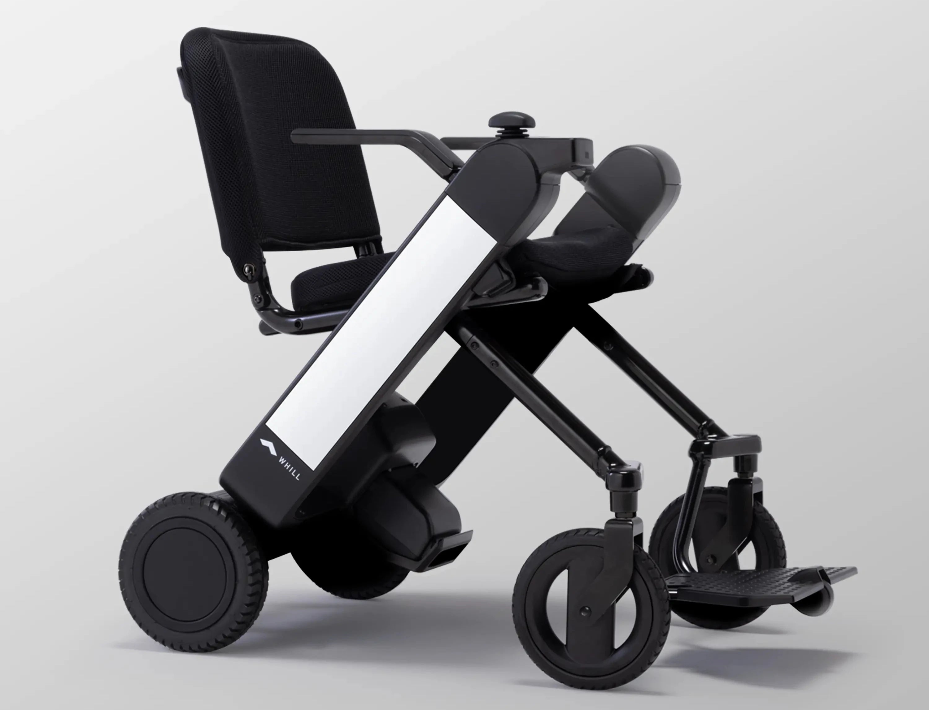 The WHILL Model F is a lightweight, foldable electric wheelchair designed for convenience and ease of travel. It folds quickly, weighing under 53 lbs without the battery, making it ideal for transport on public transit and storage in car trunks.