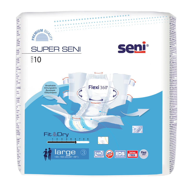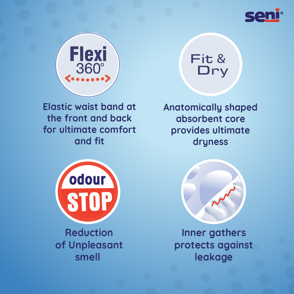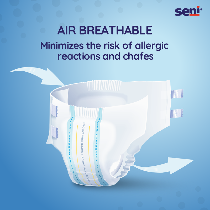 The essential feature of Seni products is Air breathability. Free air circulation significantly lowers the risk of chafes, skin irritations and bedsores prone to develop especially in bedridden patients. Breathable products are absolutely necessary to ensure proper air ventilation, avoid certain skin disorders and keep the skin in good condition