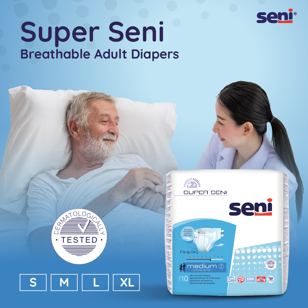 Breathable all-in-one diapers Super Seni are recommended for bedridden patients with moderate to heavy incontinence